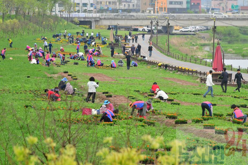 농촌지도자회, 생활개선회, 4-H(에이치)연합회, 귀농귀촌인협의회 4개 단체 회원 200여 명은 제2황룡교부터 문화대교까지 이어지는 17개 구간에 메리골드, 데이지 등 6만여 주를 식재했다.