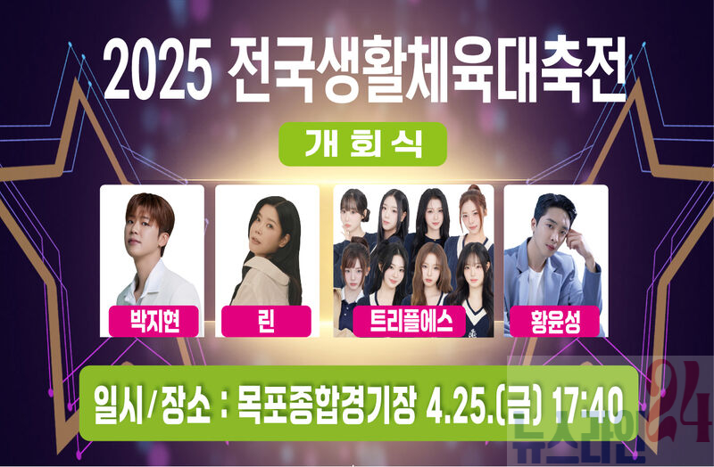 개회식은 4월 25일(금) 오후 5시 40분, 목포종합경기장에서 개최되며 별도의 입장권 없이 무료로 관람할 수 있다. 식전 공연, 선수단 입장, 축하공연 등 풍성한 프로그램으로 꾸며지며, 축하공연에는 박지현, 린, 트리플에스, 황윤성 등 인기 가수들이 무대에 올라 대회 분위기를 더욱 뜨겁게 달군다.