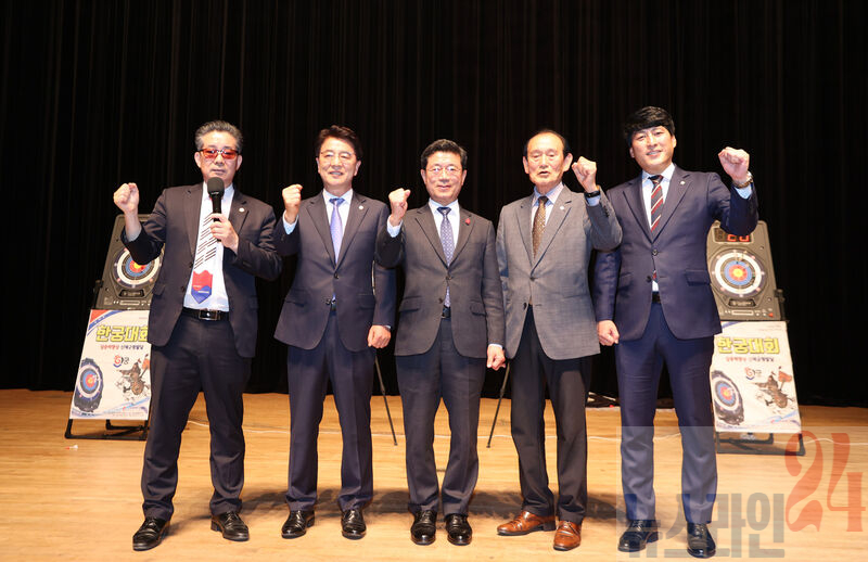 왼쪽부터 정희종 대한한궁협회 사무총장, 김태균 전라남도의회 의장, 정인화 광양시장, 김종규 (사)대한노인회광양시지회장, 최대원 광양시의회 의장)
