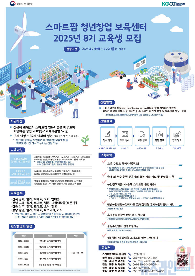 교육생 모집에 대한 자세한 사항은 누리집에 게시된 공고문을 통해 확인할 수 있으며, 오는 30일 오후 2시에 고흥 스마트팜 혁신밸리 지원센터(고흥군 도덕면 스마트팜길 74) 2층 다목적 강당에서 현장 설명회도 진행될 예정이다.