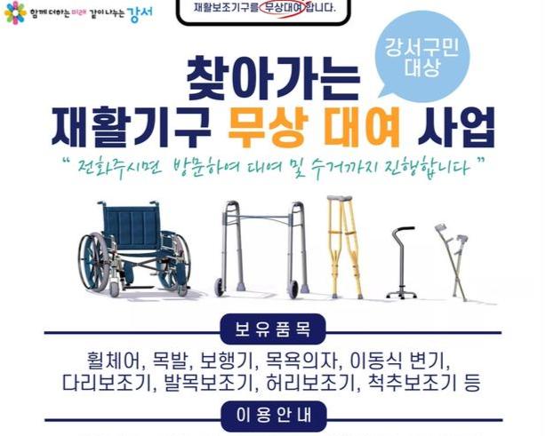서울 강서구(구청장 진교훈)는 주민 편의를 위해 `찾아가는 재활보조기구 공유 · 나눔 서비스`를 운영한다고 밝혔다.