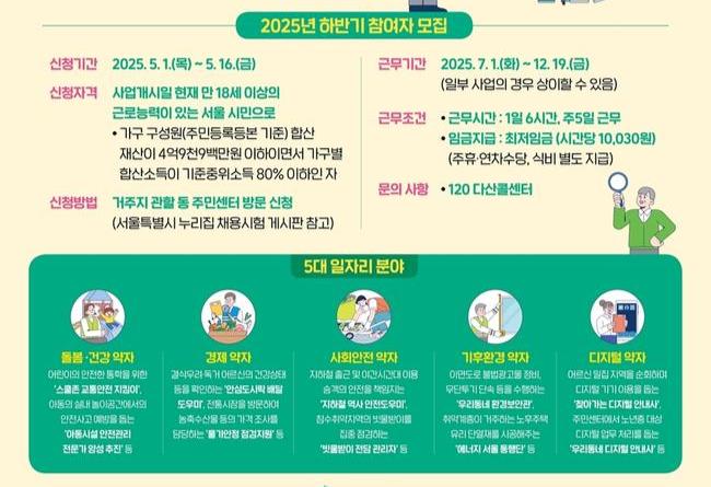 관악구(구청장 박준희)가 경제적 어려움에 놓인 저소득층, 취업 취약계층, 실직자 등의 생계지원 및 자립을 위해 `2025년도 하반기 서울 동행일자리 사업` 참여자를 모집한다.