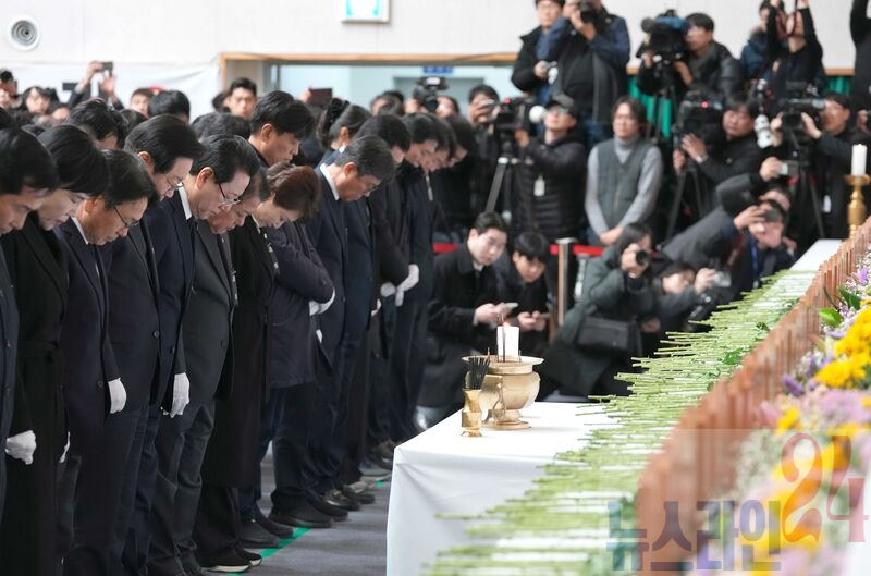 김영록 전라남도지사와 더불어민주당 이재명 대표가 30일 무안스포츠파크에 마련된 제주항공 여객기 추락사고 희생자 합동분향소를 방문해 추모하고 있다.