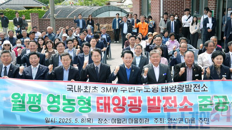 김영록 전라남도지사가 8일 영광 염산면 월평마을에서 열린 ‘주민주도 영농형 태양광 1단계(1MW) 발전단지 준공식’에서 참석자들과 기념촬영을 하고 있다.