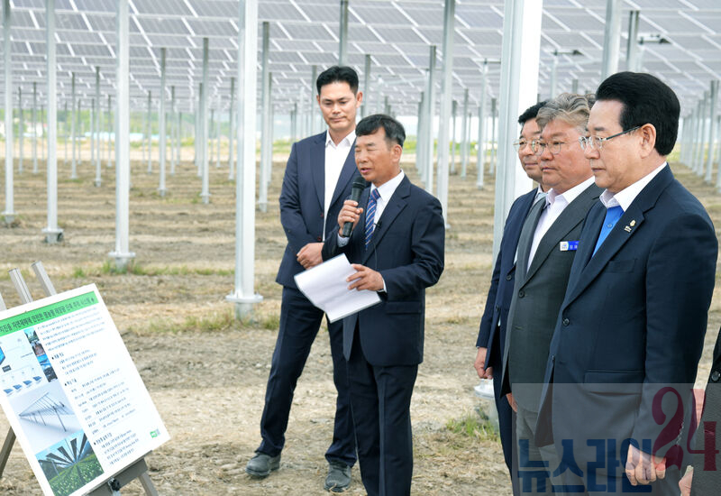 김영록 전라남도지사가 8일 영광 염산면 월평마을에서 열린 ‘주민주도 영농형 태양광 1단계(1MW) 발전단지 준공식’에서 월평햇빛협동조합 관계자로부터 발전단지 시설 현황에 대해 청취하고 있다.