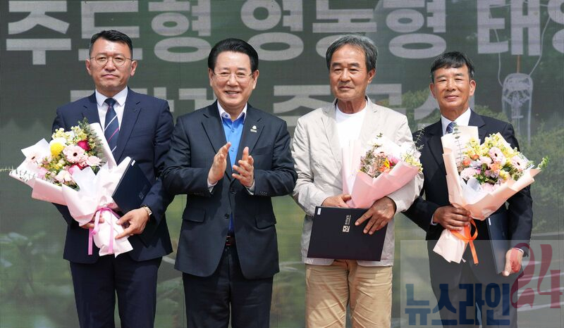 김영록 전라남도지사가 8일 영광 염산면 월평마을에서 열린 ‘주민주도 영농형 태양광 1단계(1MW) 발전단지 준공식’에서 유공자에게 표창장을 수여한 뒤 기념촬영을 하고 있다.