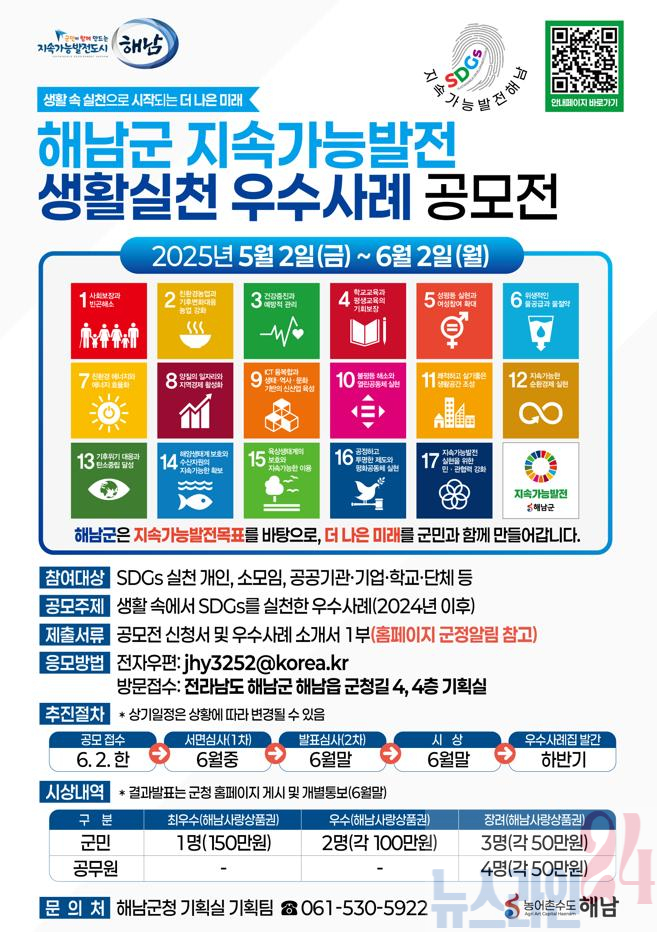 공모전은‘생활 속 실천으로 시작되는 더 나은 미래’를 주제로 ▲군민의 일상생활 속 자발적 실천 사례 ▲기관·단체·기업 등이 추진한 지속가능발전 협력 사업 사례 등 해남군의 지속가능발전목표 17개 항목 중 1개 이상과 연계된 내용이면 된다.