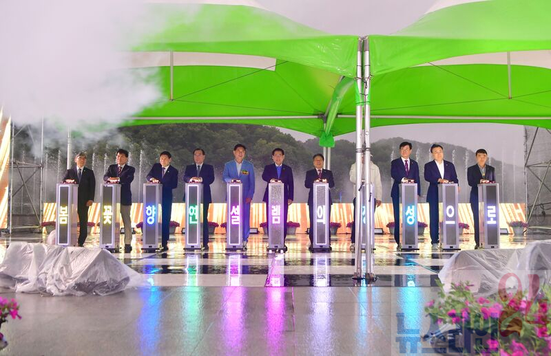 ‘개막 퍼포먼스’ 순서에서는 무대에 오른 내빈들이 동시에 점등 버튼을 눌러 ‘봄꽃 향연 설렘의 장성으로’라는 주제 문구를 전광판에 표출시켰다.