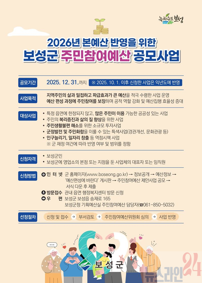 보성군은 오는 12월 31일까지 주민들의 적극적인 참여를 바탕으로 지역 발전을 위한 예산을 편성하기 위해 ‘주민참여예산 제안사업’을 상시 접수한다고 밝혔다.