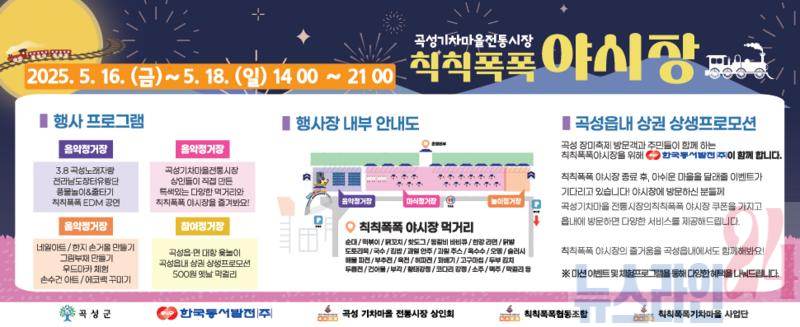 곡성군(군수 조상래)이 곡성기차마을전통시장에서 지역 상권 활성화와 전통시장 브랜딩을 위한 야간형 장터, ‘2025 칙칙폭폭야시장’을 오는 5월 16일(금)부터 18일(일)까지 3일간 개최한다고 전했다.