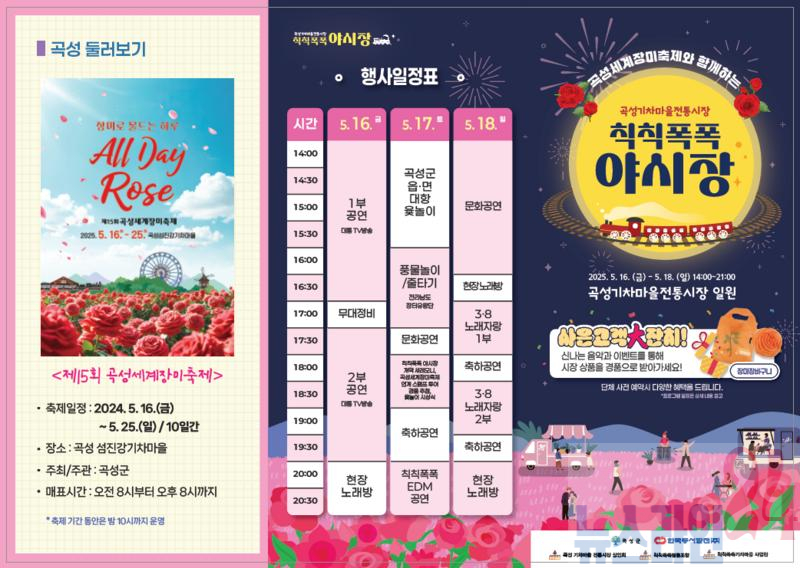 곡성세계장미축제와 연계하여 진행되는 이번 행사는 곡성 전통시장만의 개성과 문화를 담은 ‘테마형 야시장’으로, 먹거리, 공연, 체험, 주민 참여 이벤트가 어우러진 복합형 장터로 운영된다.