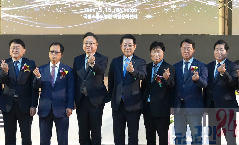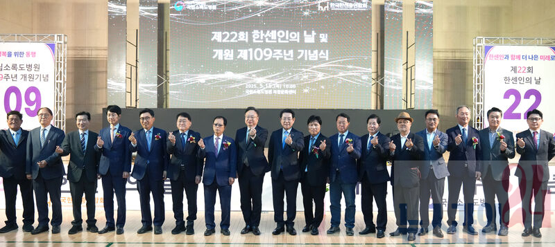 김영록 전라남도지사가 15일 국립소록도병원에서 열린 ‘제22회 한센인의 날 기념식’에서 참석자들과 기념촬영을 하고 있다.