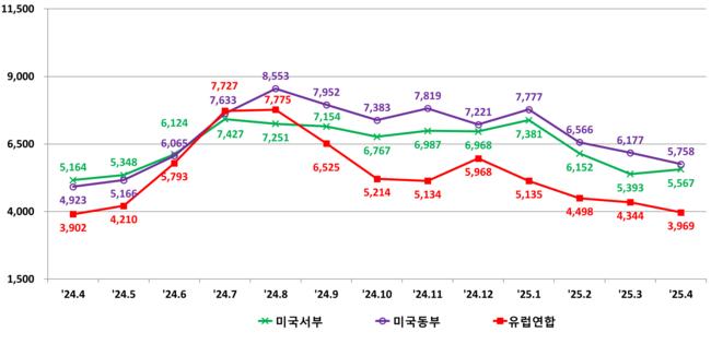 특히 유럽연합은 수입 운송비용 기준으로 5개월 연속 하락세를 이어갔다.