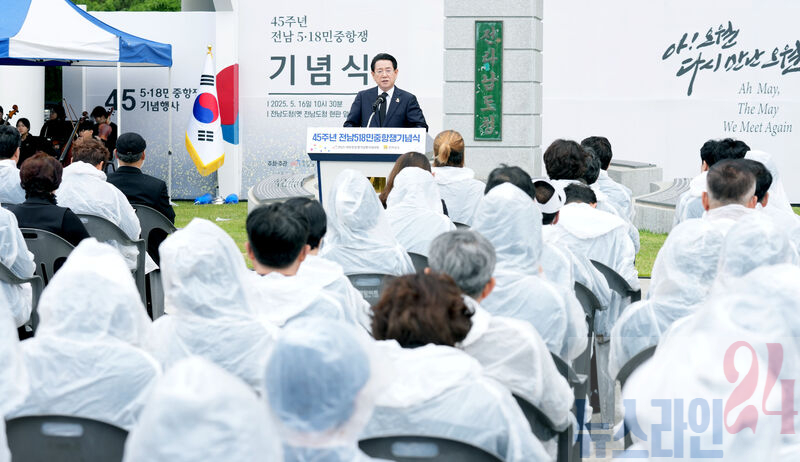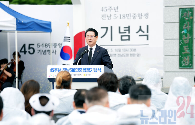 김영록 전라남도지사가 16일 오전 전남도청 앞 광장에서 ‘아! 오월, 다시 만난 오월’을 주제로 열린 ‘전남 5·18민주화운동 45주년 기념식’에서 추념사를 하고 있다.