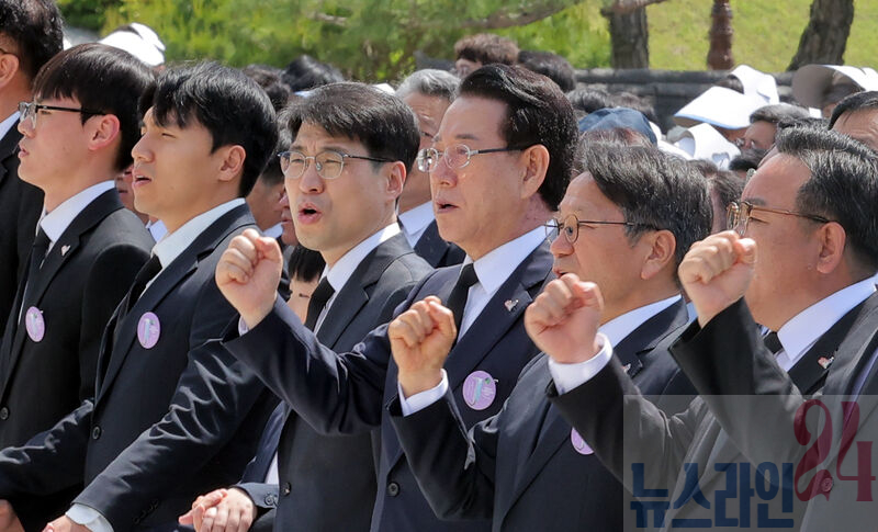 18일 광주광역시 북구 국립 5·18민주묘지에서 열린 5·18민주화운동 45주년 기념식에서 김영록 전라남도지사(오른쪽 세 번째) 등 참석자들이 ‘임을 위한 행진곡’을 제창하고 있다.