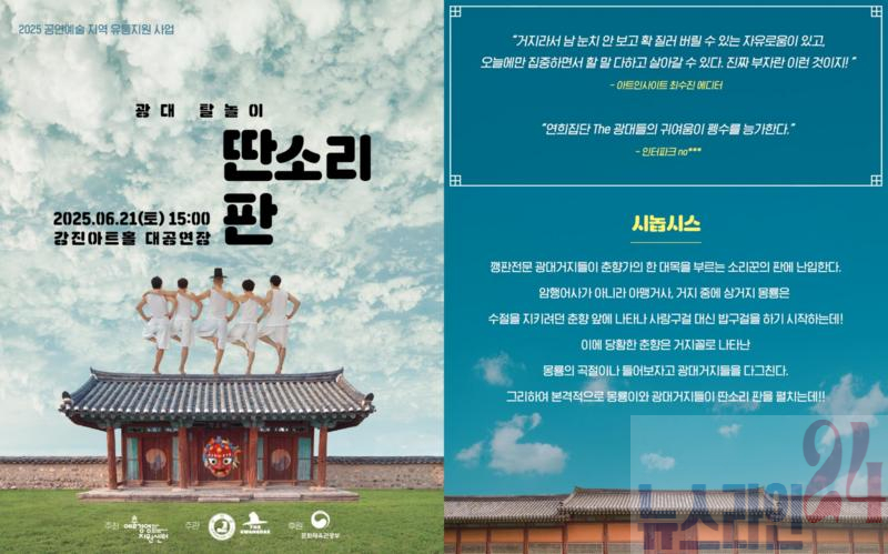 강진군이 오는 6월 21일 오후 3시 강진아트홀 대공연장에서 전통예술공연 ‘광대탈놀이 딴소리 판’을 선보인다.