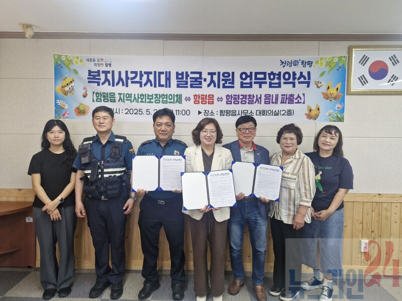 함평군은 22일 “함평읍과 함평경찰서 읍내파출소(소장 정제명), 함평읍 지역사회보장협의체(민간위원장 김행구)가 지난 20일 복지사각지대 발굴 및 지원 강화를 위해 업무협약을 체결했다”고 밝혔다.