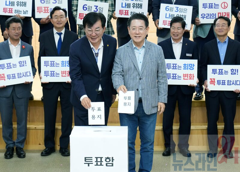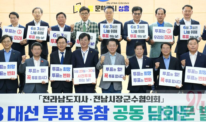 김영록 전라남도지사가 27일 장흥군청에서 열린 ‘전남시장·군수협의회 임시총회’에 참석, 시장·군수들과 투표참여 독려 퍼포먼스를 하고 있다.