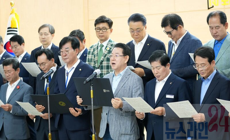 김영록 전라남도지사가 27일 장흥군청에서 열린 ‘전남시장·군수협의회 임시총회’에 참석, 공동 담화문을 발표하고 있다.