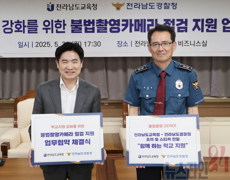 전라남도교육청(교육감 김대중)과 전라남도경찰청(청장 모상묘)은 26일 전라남도교육청에서 ‘불법 촬영 카메라 점검 및 학교 지원 체계 구축’을 위한 업무협약을 체결했다.
