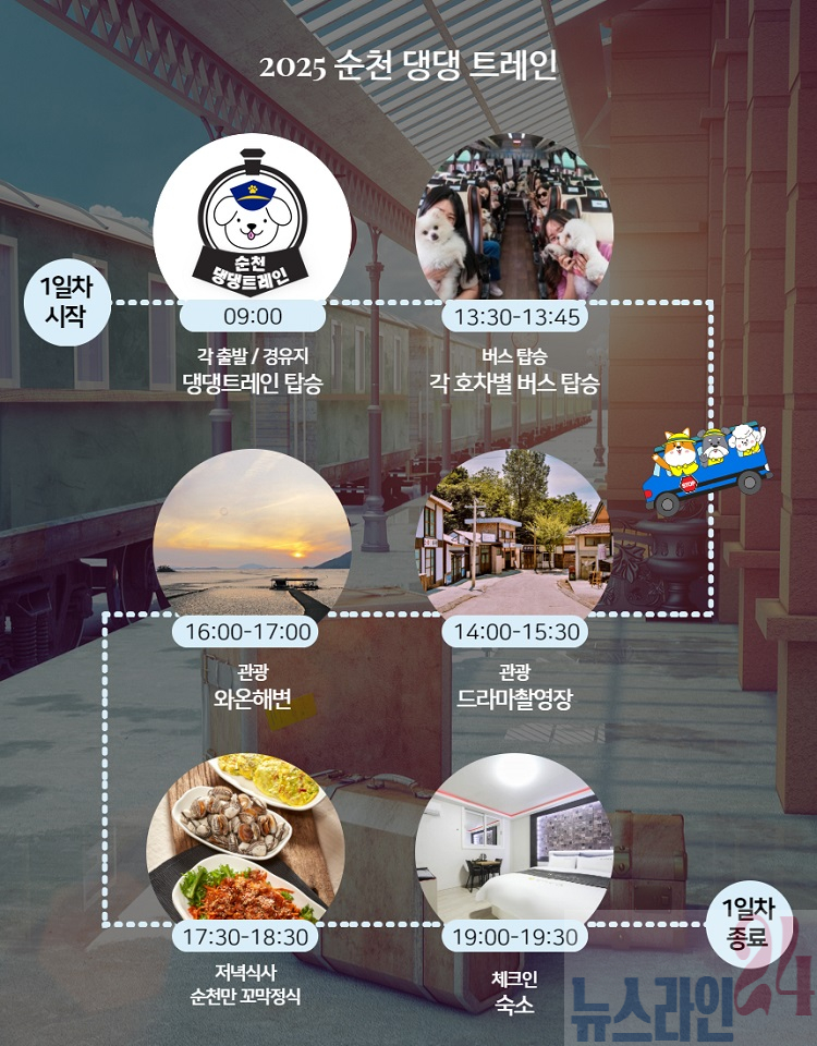 순천시(시장 노관규)는 반려동물 친화관광도시 조성을 위해 전남 최초의 반려견 전용 열차 상품인 「2025 순천 댕댕트레인」을 기획·운영하며, 오는 6월 첫 운행을 앞두고 참가자를 모집 중이다고 밝혔다.