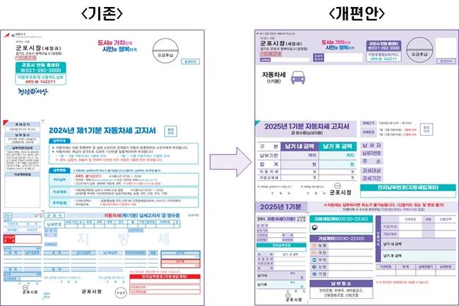 군포시는 이번 개편을 통해 고지서 이해도를 높이고 납세 편의성을 향상하는 것은 물론 행정 효율성 및 신뢰도를 강화할 것으로 기대한다. 6월 자동차세 납부고지서를 시작으로 재산세, 주민세, 등록면허세 등 정기분 및 독촉분 고지서에도 적용할 예정이다.