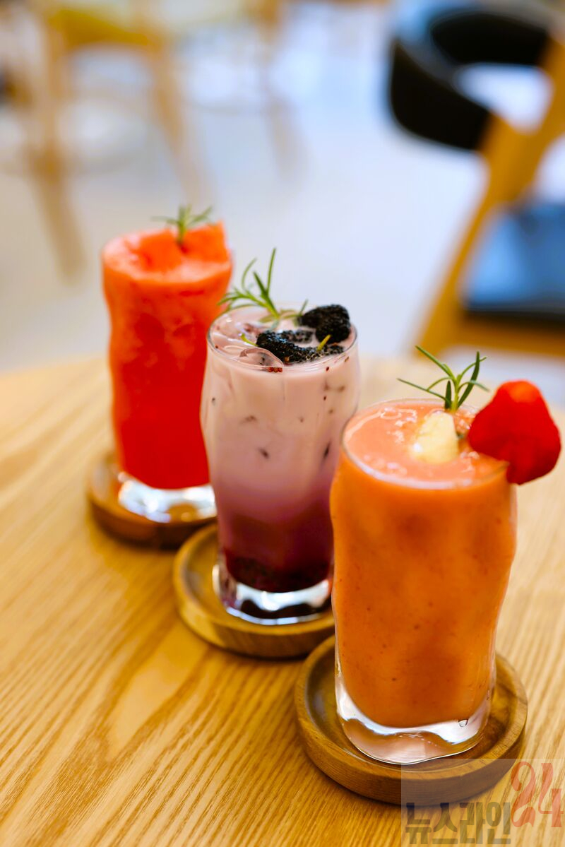 ‘과일카페존’에선 장성산 과일로 만든 주스와 커피, 음료, 간식 등을 판매한다. 차 한잔과 함께 담소를 나눌 수 있는 테이블도 별도로 마련되어 있다.