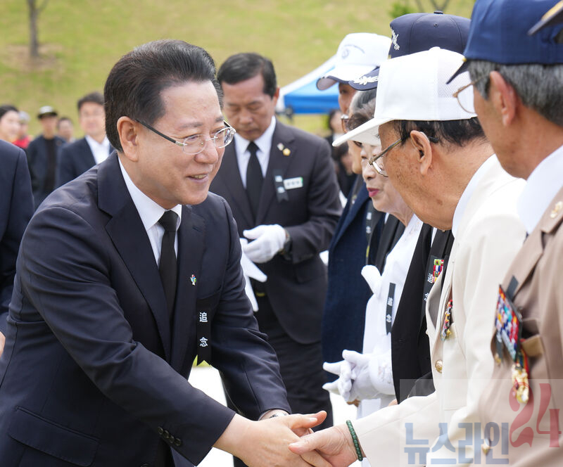 김영록 전라남도지사가 6일 담양군 평화예술광장에서 열린 ‘제70회 현충일 추념식’에 참석, 6·25 참전용사들과 인사를 나누고 있다.