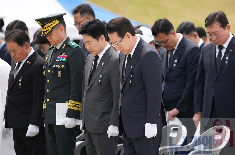 김영록 전라남도지사가 6일 담양군 평화예술광장에서 열린 ‘제70회 현충일 추념식’에 참석, 사이렌 취명에 맞춰 묵념을 하고 있다.