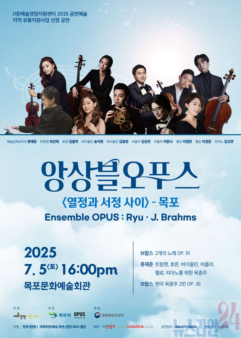 이번 공연은 시민들의 문화예술 향유 기회 확대를 위해 문화체육관광부와 예술경영지원센터가 추진하는 ‘2025년 공연예술지역 유통지원사업’ 선정작으로, 2009년 창단된 실내악의 명가 ‘앙상블오푸스’가 감동적인 무대를 선사할 예정이다.