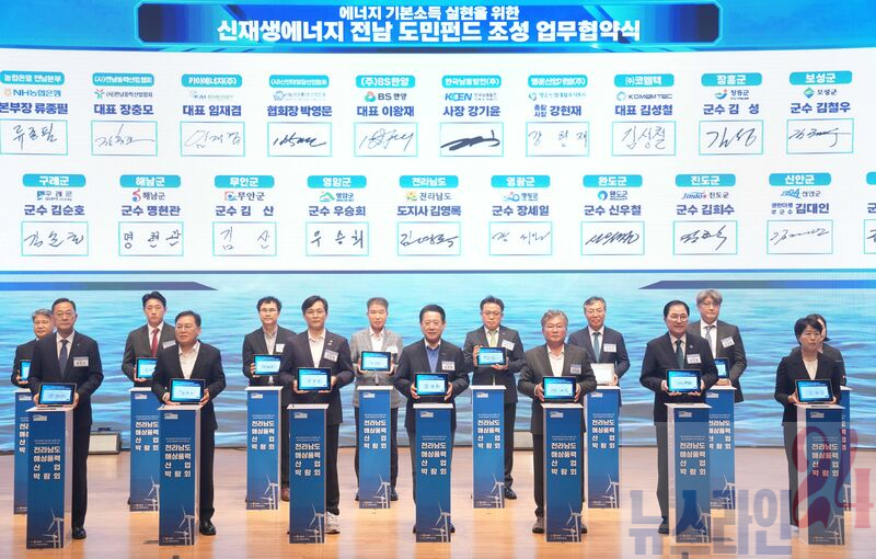 김영록 전라남도지사가 18일 여수엑스포컨벤션센터에서 열린 ‘전라남도 해상풍력 산업박람회’에 참석해 시·군, 발전사들과 에너지 기본소득 조성 및 해상풍력 기자재 공급망 구축을 위한 업무협약을 체결하고 있다.