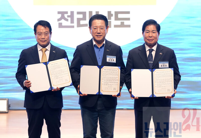 김영록 전라남도지사가 18일 여수엑스포컨벤션센터에서 열린 ‘전라남도 해상풍력 산업박람회’에 참석해 정기명 여수시장, 공영민 고흥군수와 해상풍력 보급 확대를 위한 동부권 13GW 비전선포 도-시·군 공동결의문을 발표하고 있다.