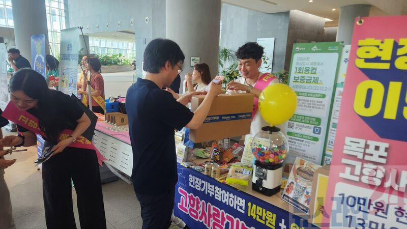 점심시간을 활용해 행정안전부 로비에서 각 지자체의 열띤 홍보가 펼쳐진 가운데, 목포시는 홍어, 갈치, 낙지, 김, 해상케이블카탑승권 등 항구도시 목포의 매력적인 답례품과 ▲자립준비청년 교육비 지원 ▲공동생활가정 꿈꾸는 공부방 만들기 ▲왕초보 부모 탈출 프로젝트 ▲보행 시민 위한 횡단보도 안전 시설물 설치 ▲시민의 독서문화 요구를 반영한 도서 확충의 5개 기금사업 알리기에 주력했다.
