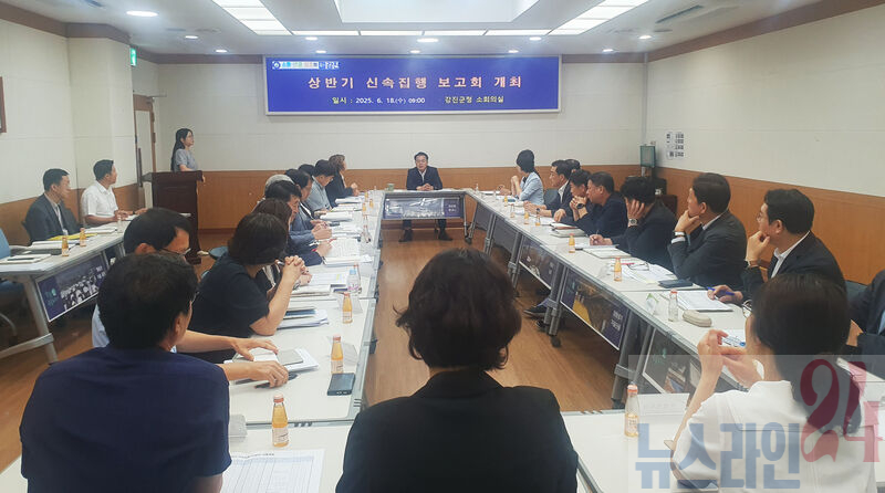 강진군이 지난 18일 군청 소회의실에서 ‘2025년 상반기 신속집행 추진상황 보고회’를 개최해 상반기 시설비 사업의 집행 실적을 점검하며 실효성 있는 집행 방안을 모색했다.