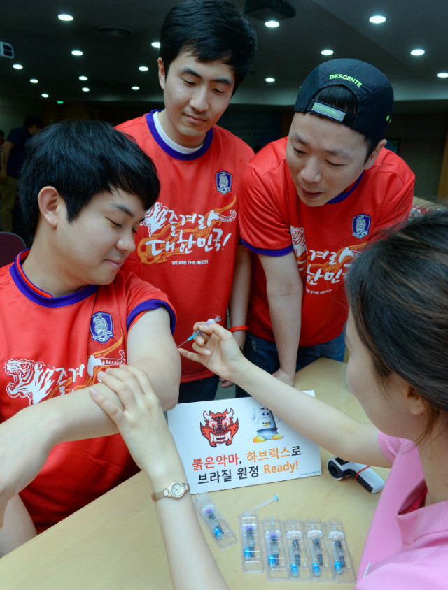 글락소 스미스클라인은 브라질 월드컵 개막을 앞두고 현지 원정 응원에 나서는 국가대표팀 서포터즈 붉은악마 110명을 대상으로 A형 간염 예방 백신 하브릭스 접종을 무상 지원한다고 밝혔다. (사진제공: 글락소스미스클라인) GSK는 A형 간염 백신 외에도 파상풍 예방을 위해 Tdap(디프테리아, 백일해, 파상풍) 백신 ‘부스트릭스’와 말라리아 치료제 등 해외 여행 시 주의해야 할 질환의 예방 백신과 치료제도 추가로 지원했다. 또한, 현장 진료 및 접종은 순천향대학교 서울병원 의료진의 재능 기부와 진료비 지원을 통해 이뤄졌다.