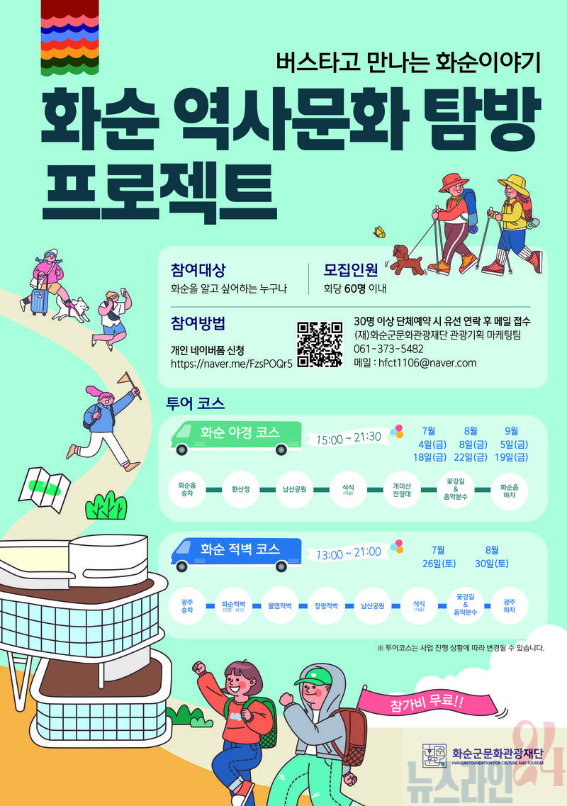자세한 일정·내용·신청 방법은 (재)화순군문화관광재단 홈페이지(https://www.hfct.or.kr) 를 통해 확인할 수 있다. (네이버 폼, 유선 접수 [개인과 단체] 선착순 마감)