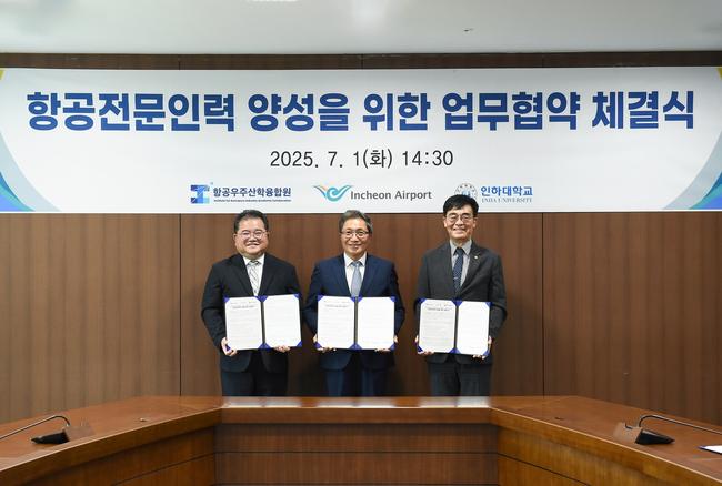 인천국제공항공사(사장 이학재)는 지난 1일 공사 회의실에서 인하대학교(총장 조명우), 항공우주산학융합원(원장 유창경)과 `항공전문인력 양성을 위한 양해각서(MOU)`를 체결했다.