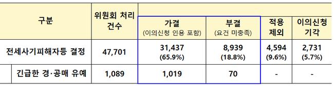 이번에 가결된 1,037건 중 922건은 신규 신청 및 재신청 건이며, 115건은 기존 결정에 대한 이의신청을 통해 피해자로 인정됐다. 반면 671건은 요건 미충족으로 부결됐고, 249건은 보증보험이나 최우선변제금 등으로 보증금 전액을 반환받을 수 있어 적용 대상에서 제외됐다. 194건은 이의신청 기각 건이다.