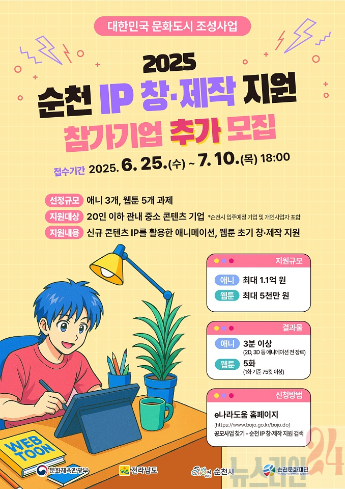 한편, ‘순천 IP 창·제작 지원 사업’은 대한민국 문화도시 조성사업의 일환으로 순천시와 (재)순천문화재단이 공동 추진하며, 자세한 내용은 순천문화재단 누리집 또는 e나라도움 공모사업목록에서 확인할 수 있다.