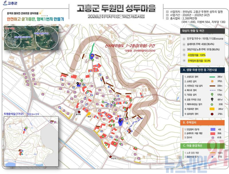 고흥군(군수 공영민)은 대통령 직속 지방시대위원회가 주관하는 ‘2026년 농어촌 취약지역 생활여건 개조사업’공모에서 과역면 가산마을과 두원면 성두마을 2개 지역이 최종 선정되는 쾌거를 이뤘다고 밝혔다.