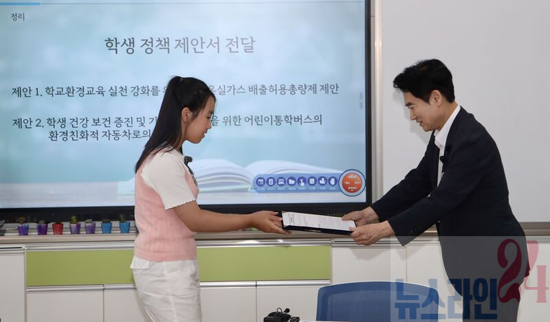 수업의 마무리는 학생들의 목소리로 채워졌다. 세 명의 학생은 환경·사회·자치를 대표해 실천 선언문을 낭독했다. 그리고 지구의 미래를 지키기 위한 약속과 정책 제안서를 김대중 교육감에게 전달했다.