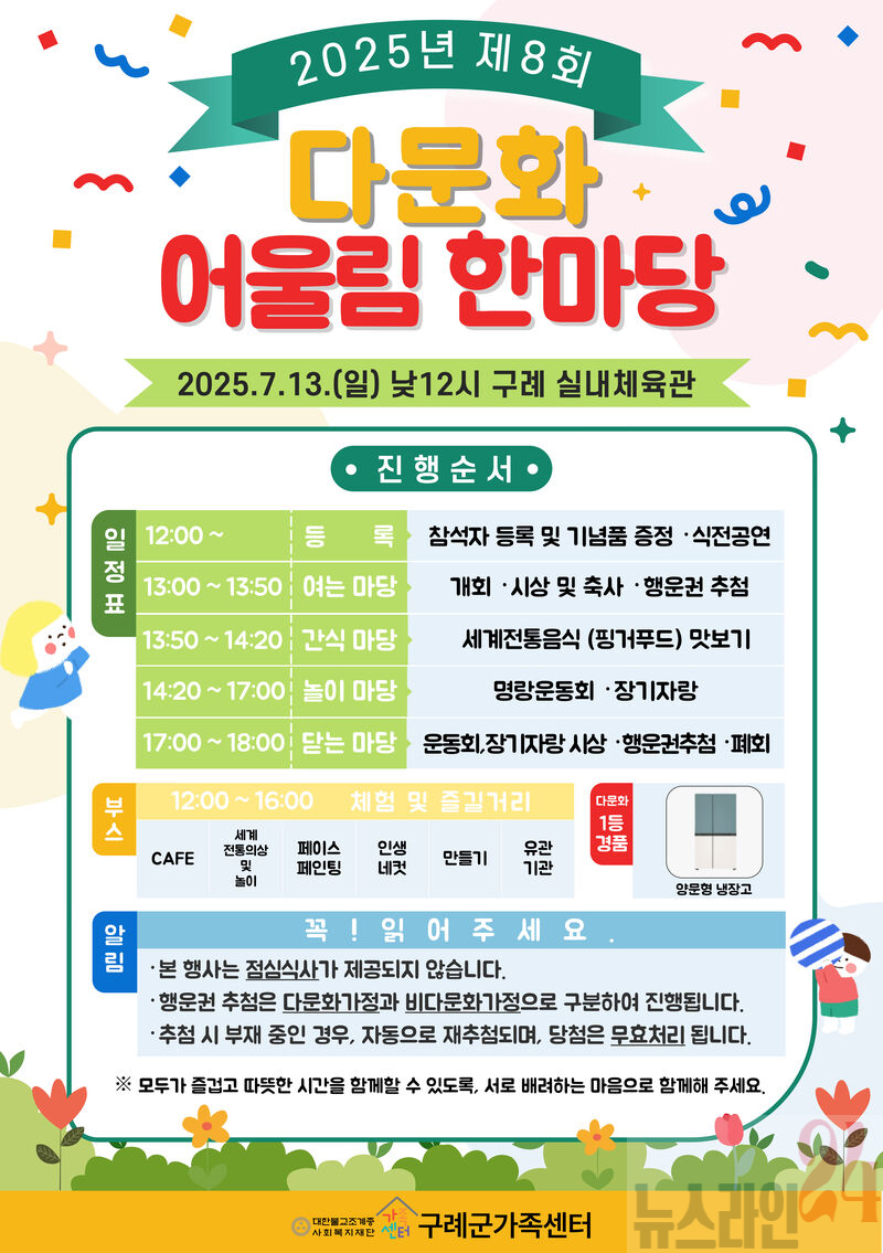 전남 구례군은 오는 7월 13일(토) 12시부터 18시까지, 2025년 제8회 다문화 어울림 한마당 행사를 개최한다고 밝혔다.
