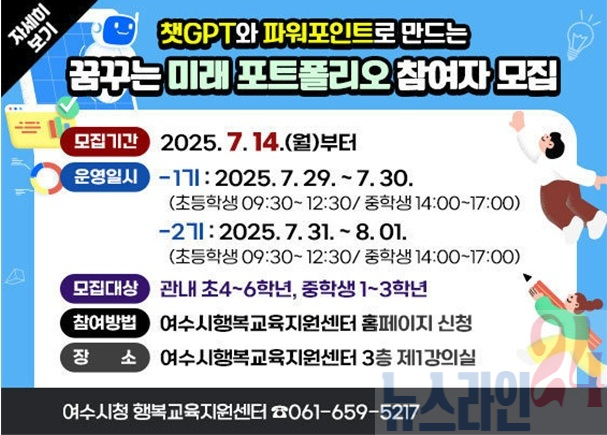 기타 자세한 사항은 여수시 평생교육과(☎061-659-5217)로 문의하면 된다. 시 관계자는 “이번 프로그램은 단순한 컴퓨터 활용 교육을 넘어, 학생들이 스스로 정보를 탐색하고 이를 체계적으로 정리․발표하는 과정을 통해 미래 역량을 키울 수 있는 소중한 기회가 될 것”이라며 많은 관심과 참여를 당부했다.