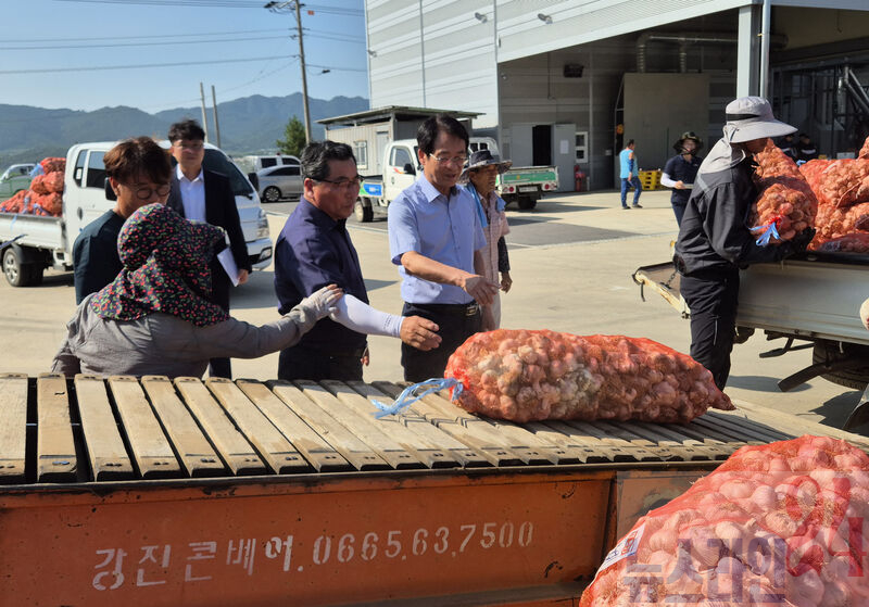 강진원 강진군수가 마늘 수매가 한창인 지난 9일 강진한들농협 마늘 수매 현장을 찾아 무더운 날씨에도 불구하고 농산물 판매에 애쓰는 농민들을 격려하고 실질적인 지원방안을 모색했다.