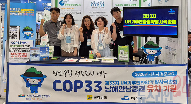 여수시(시장 정기명)는 지난 9일부터 3일간 광주광역시 김대중컨벤션센터 열린 ‘2025 대한민국 기후환경 에너지 대전(KEET2025)’에 참가해 제33차 UN기후변화협약 당사국총회(COP33)의 남해안 남중권 유치를 위한 홍보 활동을 펼쳤다.