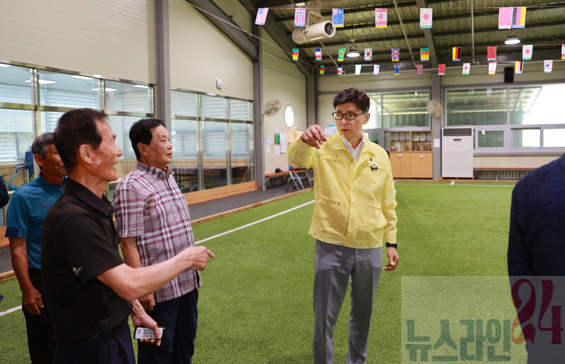 14일, 김철우 보성군수가 지속적인 폭염에 대응하고자 문덕면 실내게이트볼장을 찾아 시설물 점검 및 관리 상태를 세심히 살피고 있다.