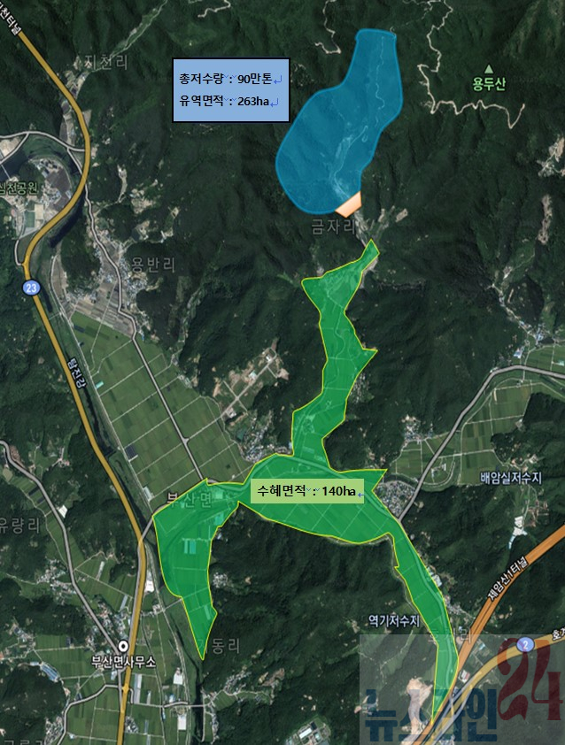 금자지구 다목적 농촌용수개발사업은 부산면 금자리 일원에 총저수량 90만톤의 신규저수지 1개소와 관수로 5.7km를 설치하는 대규모 농업기반 정비 사업이다.