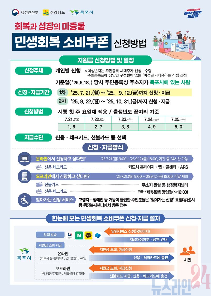 목포시, 민생회복 소비쿠폰 지급 준비완료…21일부터 신청하세요 신용·체크카드 및 선불카드로 지급 선불카드 신청 시 주민등록상 주소지 동 행정복지센터 방문 신청 첫 주 21일부터 25일까지 요일제 적용…출생년도 끝자리 기준