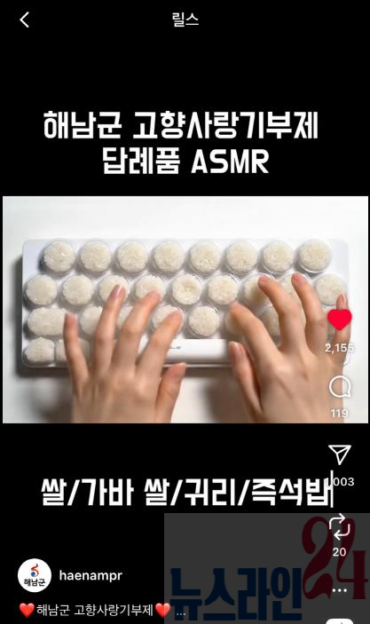 AI 기술을 활용해 제작한‘해남고향사랑기부제 답례품 ASMR’영상은 지난 9일 군 인스타그램 계정에 게재된 후 일주일만에 조회수 30만회를 돌파했다.