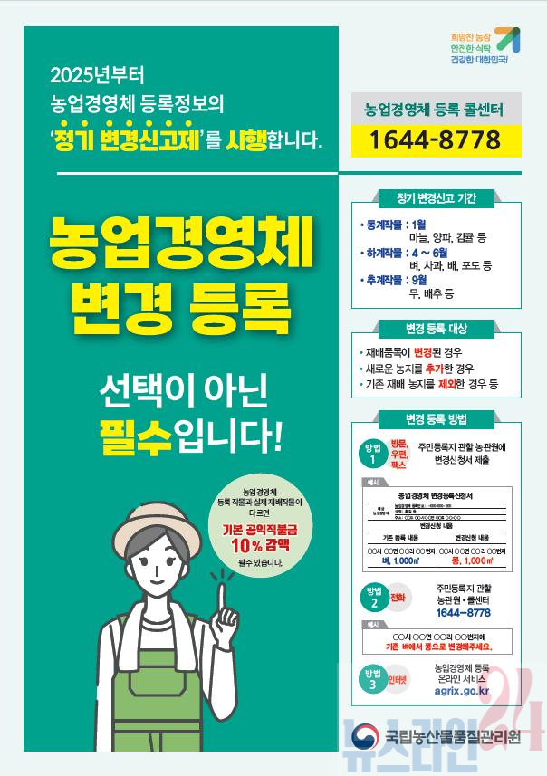 농업경영체 등록 농업인은 공익직불금 등 농업 관련 융자‧보조금 혜택을 받는 대신 재배품목·농지 등이 변경될 경우 반드시 농관원에 변경신고를 해야 하는 의무가 있다.